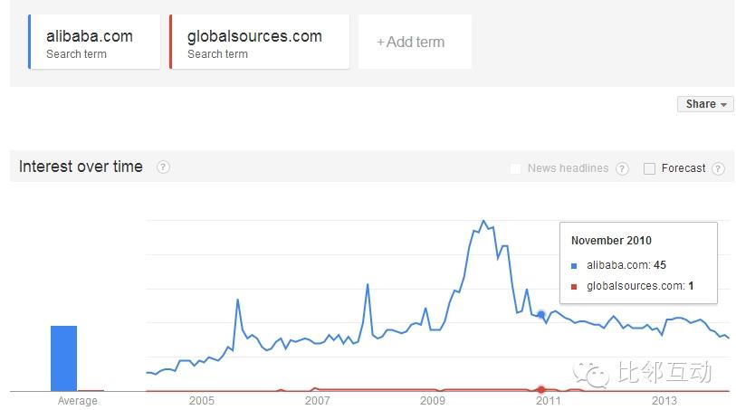 總體而言,阿里巴巴的整體搜索流量在近十年來遠遠超過了環(huán)球資源,呈現(xiàn)穩(wěn)步增長的趨勢。其中在2009年和2010年增幅明顯,之后回歸穩(wěn)步增長,特別是2013年以來。