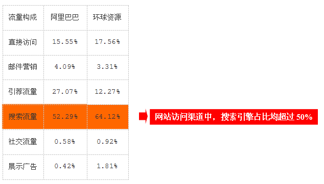 從平臺的流量情況,阿里巴巴和環(huán)球資源過去一年的流量對比數(shù)據(jù)中,不僅可以了解阿里巴巴和環(huán)球資源平臺優(yōu)劣勢,還能夠從各種渠道特點中發(fā)現(xiàn)什么才是平臺流量來源的主力軍。