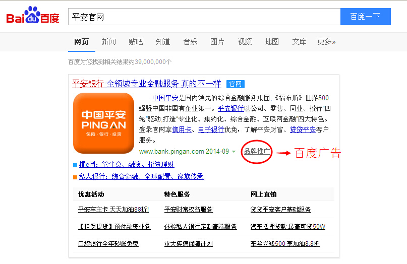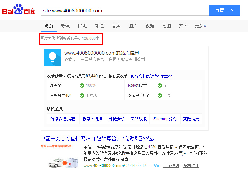 平安官網(wǎng):之前百度首頁的自然排名均被pingan.com域名占據(jù),先我方操作網(wǎng)站4008000000.com排名進入首頁