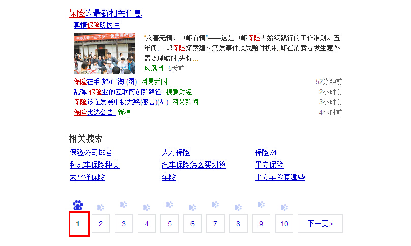 保險:操作初期,“保險”一詞排名在百度自然排名十頁以外,經(jīng)我方操作一段時間后,現(xiàn)穩(wěn)定在首頁